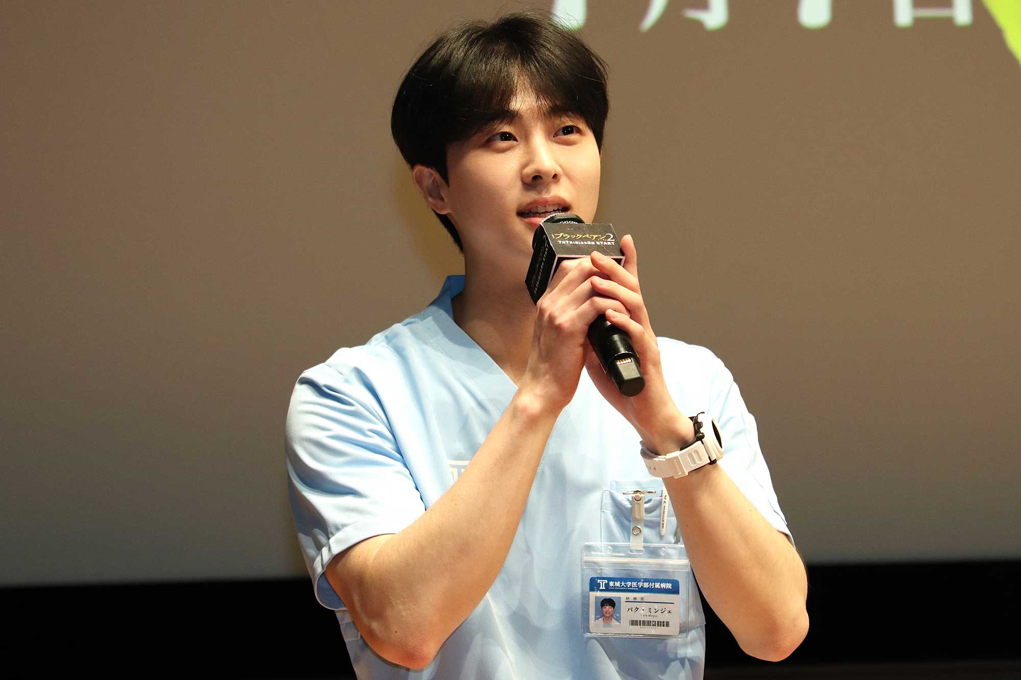 そんな天城と初対面するシーンについて振り返ったのは、6年前より成長した外科医・世良を演じる竹内さん。「瓜二つの先生と真っ向から勝負して、コテンパンにやられて、奇跡を見せつけられて……。医者としての燃えたぎるものが1話ではすごく出てきたなと思います」と回顧。さらに韓国からやって来た俳優・ムジュンさんについては「時間もないなか、日本語をあれだけ聞き取りやすく、やり遂げたことは本当にすごい。感動しました!」と会場に詰めかけたファンに拍手を求めました。ムジュンさんは竹内さんについて、「いつも声をかけてくれた」と感謝を述べました。